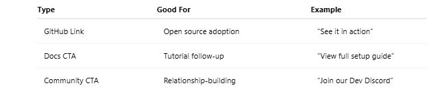 - Use soft, relevant CTAs (e.g., "Check out our GitHub repo")